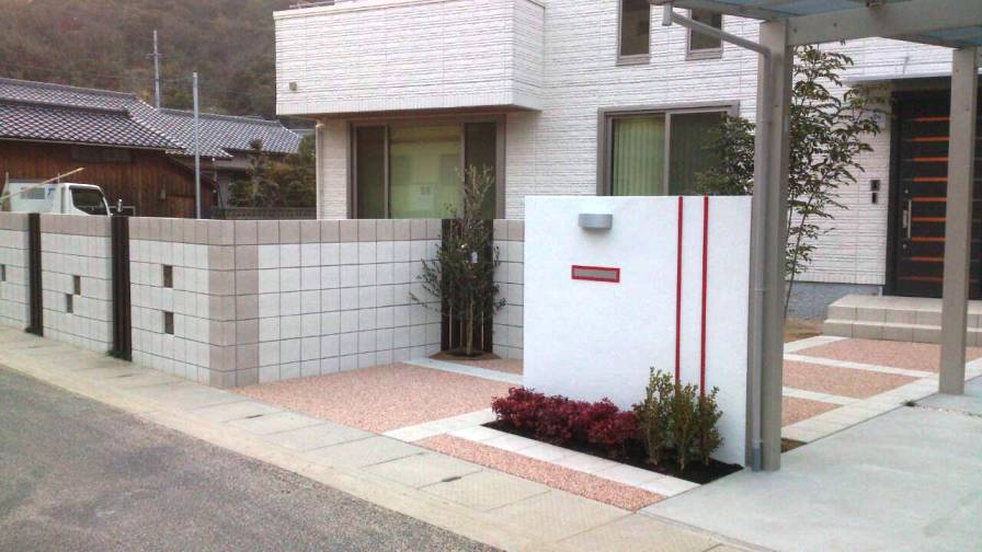 香川県直島町 S様邸 エクステリア工事 ◆S様はOBのお客様からのご紹介で施工させていただきました。全体のイメージはナチュラルな感じに 建物の白を基調としました。アプローチはIラインではなくSラインでデザインしコーナー部分には植栽で目隠しの機能も持ち ご来客様にも審美性と癒し効果に。