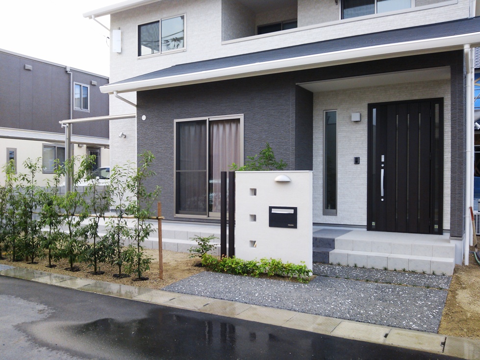 岡山市北区 K様邸 エクステリア工事 ◆和モダンをイメージと言う事で、ポストは玄関ドアの色に合わし柿渋色門柱は建物と統一し白の塗装仕上げ、アプローチはコンクリートの洗い出し仕上げ、大きな吐き出し窓にはYKKヴェクター テラスそしてタイルデッキを施工しその前にはシラカシの生け垣をし道路からの目隠しをし憩いの空間が出来上がりました。
