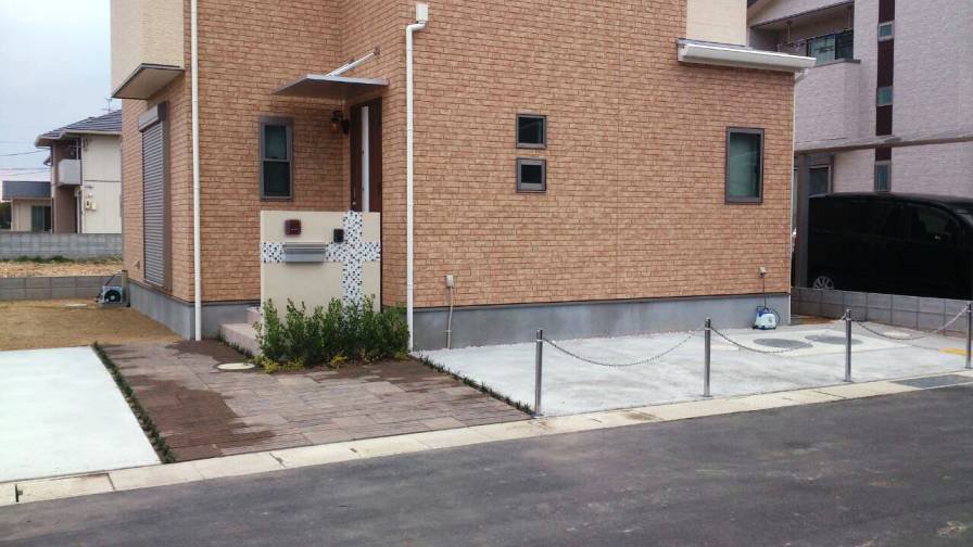 岡山市南区 S様邸 エクステリア工事 ◆門柱はモザイクタイルにポストはユニソン埋め込みポスト ロワールを設置バイク、自転車を置くための全面パネル付きのYKKヴェクター テラス普段使わないスペースには上下式のチェーンポールを設置しナチュラルな外構に。
