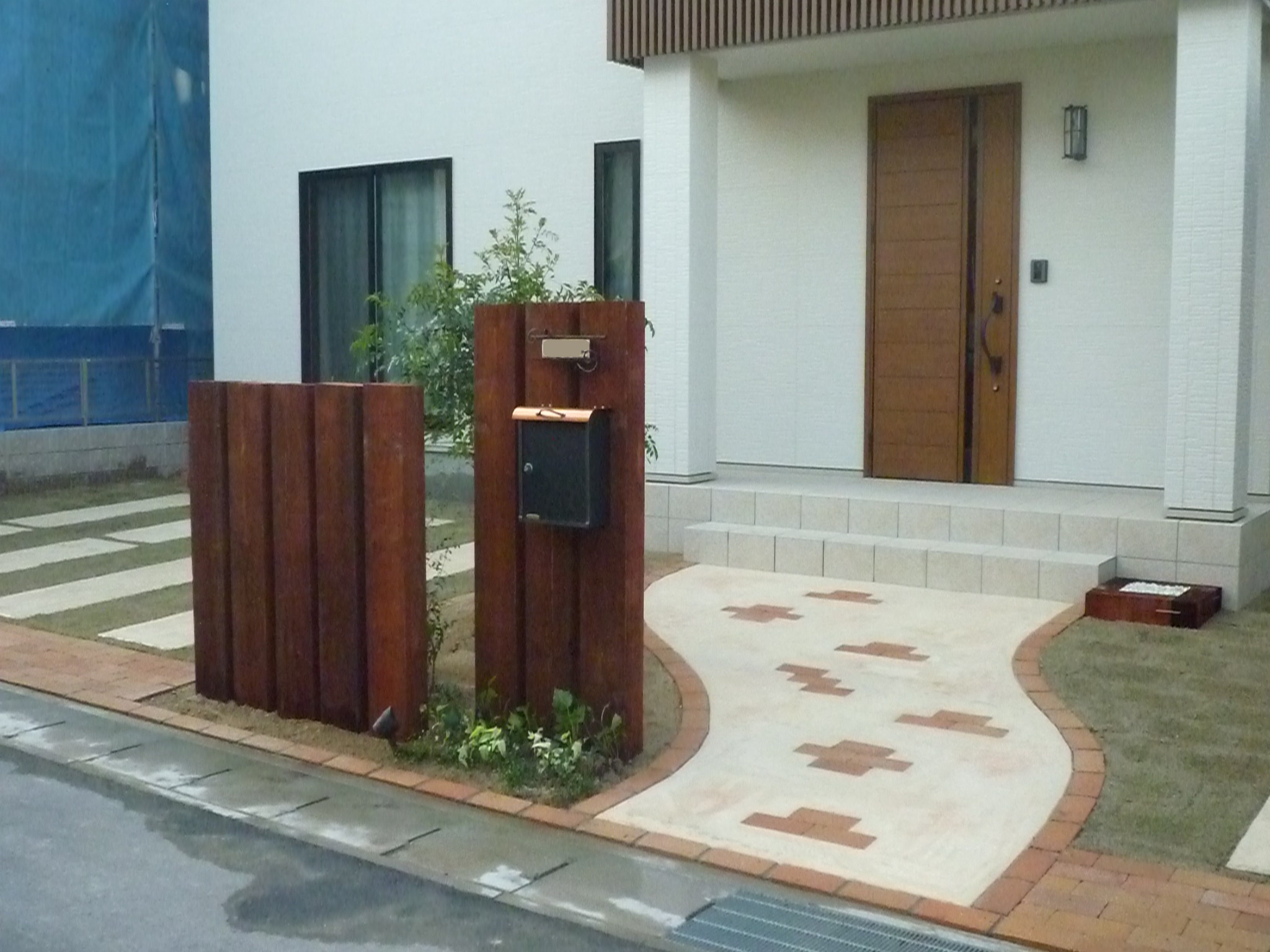 ◆駐車場入り口にはレンガを敷き、門柱には枕木を使用しました。コンクリートにも色を付け(グランドコンクリート)芝生の緑とブラウンの配色で洋風に。