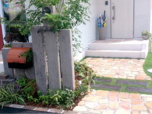 岡山県 美容室様邸 エクステリア工事 ◆アンティークテイストが好きなオーナーさまに、 アンティークな枕木門柱、レンガ や枕木を敷いたアプローチ、植栽は芝生を貼りシマトネリコやオリーブ、低木、芝生を貼り 大満足な笑顔で ハイ チーズ!